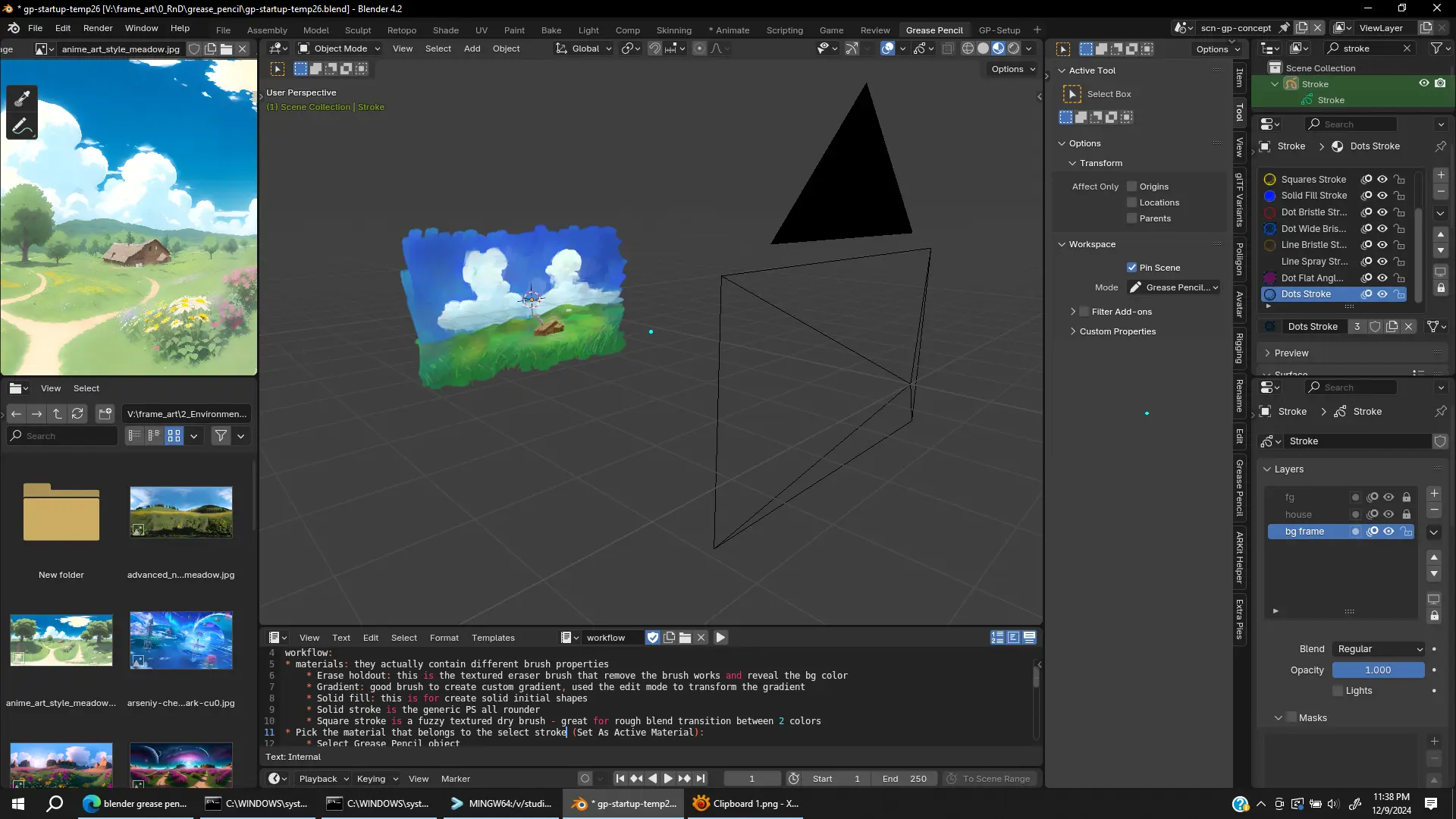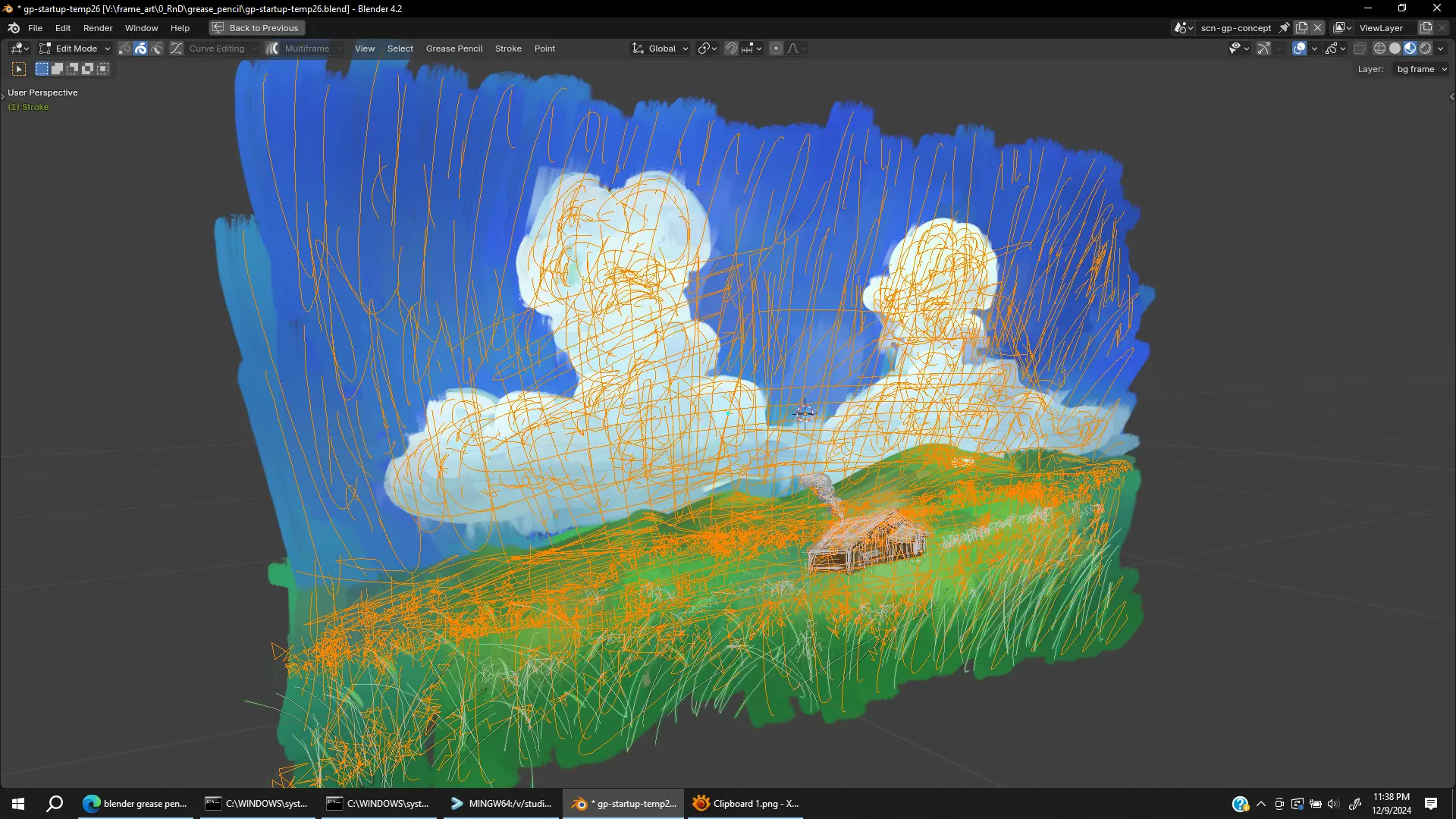 I developed a bunch of custom brushes to mimic traditional media using Blender's Grease Pencil feature. A custom brush builder was create to build and test new brushes more easily. Along with a customized painting UI layout that was added to my blender's startup file, I can make both 3d and 2d art within a single application right away using this bespoke setup.